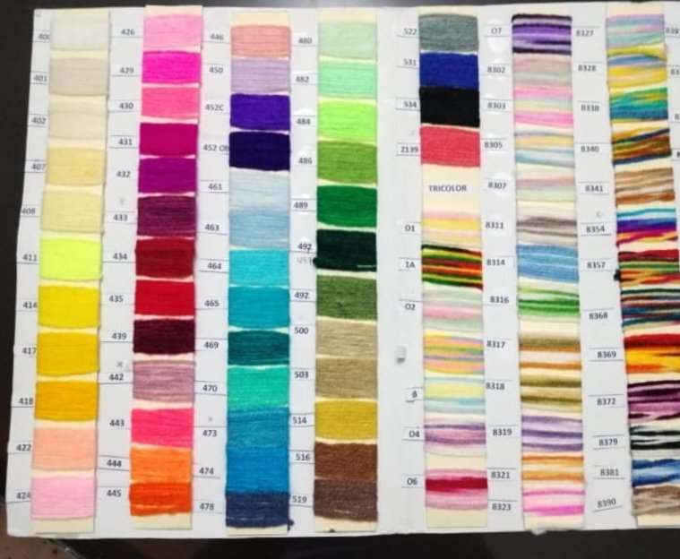 | Color lana Mi Amigo | Blanco (400), Crudo (401), Perla (402), Amarillo garbanzo (407), Amarillo pálido (408), Amarillo neón (411), Amarillo Canario (414), Amarillo mandarina (417), Amarillo girasol (418), Salmón (422), Rosado pálido (424), Rosado quinceañera (426), Rosado maravilla (429), Rosado cebada (430), Fucsia (431), Bugambilia (432), Vino (433), Rojo cereza (434), Rojo encendido (435), Ocre (439), Rosa vieja (442), Rosado neón (443), Naranja neón (444), Naranja (445), Carne (446), Morado lila (450), Morado uva (452C), Celeste pálido (461), Celeste cielo (463), Celeste frozen (464), Celeste aqua claro (465), Verde turquesa oscuro (469), Verde turquesa claro (470), Celeste aqua medio (473), Celeste aqua oscuro (474), Azul negro (478), Verde menta claro (480), Verde menta encendido (482), Verde neón (484), Verde limón (486), Verde hoja (489), Verde botella (497), Verde musgo (492), Beige claro (500), Beige oscuro (503), Mostaza (514), Café claro (516), Café oscuro (519), Gris (522), Azul bandera (531), Negro (534), Sandía (Z119) |